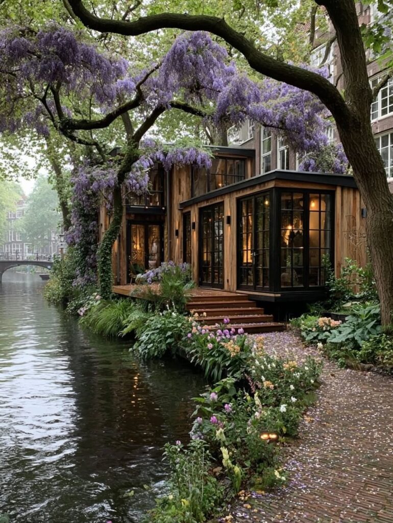 By the canal, the wooden glass home sings with romance. Overarching wisteria creates a purple canopy, and reflections ripple across the water. The warm interior glows softly, making it a perfect sanctuary for those who dream of tranquil days and artistic nights.