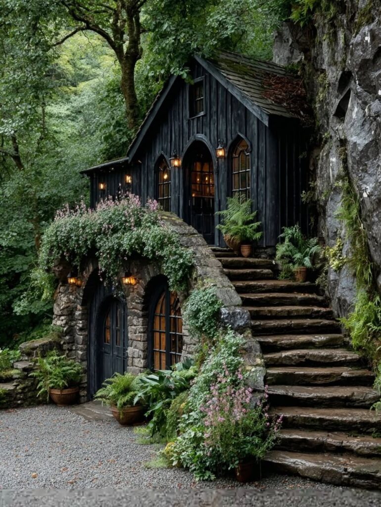 Carved into a rocky hillside, the dark forest cottage feels mystical and ancient. Mossy stone steps and arched doorways create a sense of wonder, as if the home has stood for centuries. Inside, warm lights flicker, promising safety and comfort amid the wilderness.