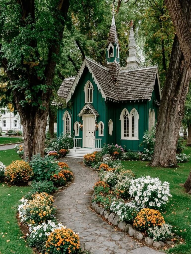 The first cottage, green and whimsical, stands like a storybook chapel embraced by ancient trees. Its pointed roofs, arched windows, and flower-lined path evoke a timeless charm that instantly soothes the soul. It feels like a sanctuary for quiet mornings and gentle living.