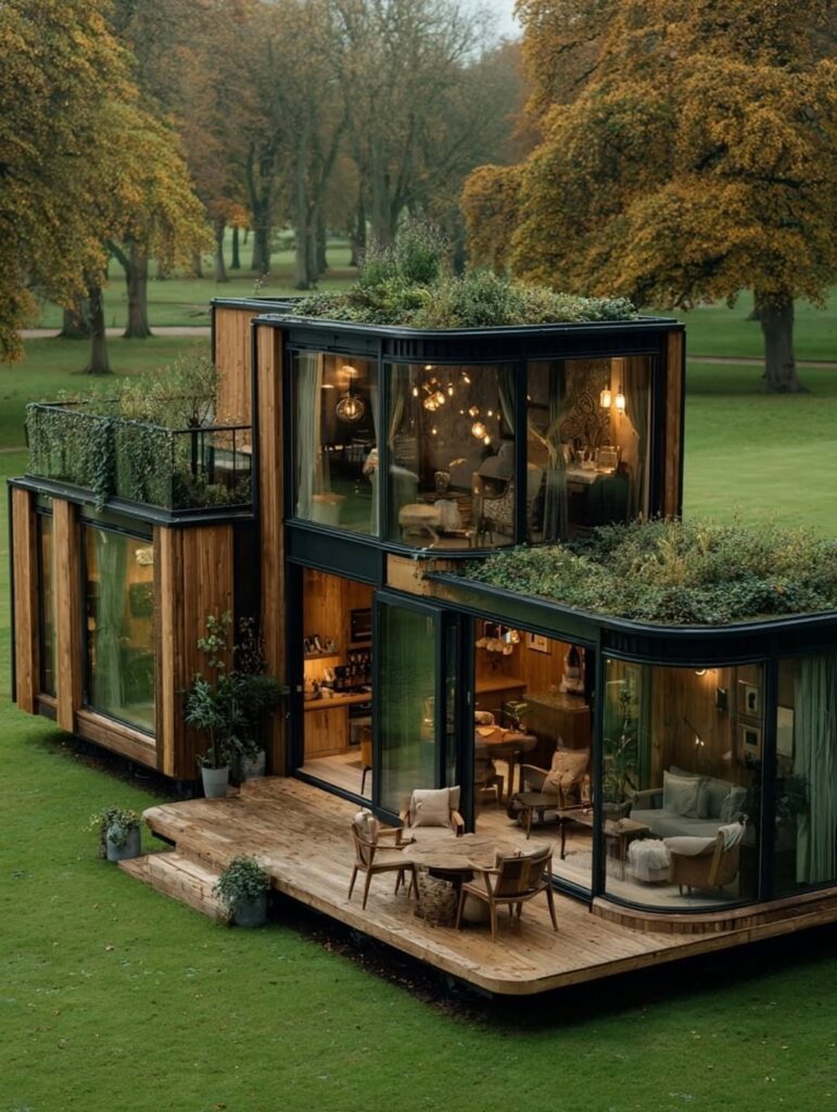The final modern home rises in layered glass and wood, crowned with living greenery on its rooftops. Its open design embraces nature, offering uninterrupted views of the golden autumn trees. It’s a masterpiece of sustainable, luxurious living—where indoor and outdoor life blend effortlessly.