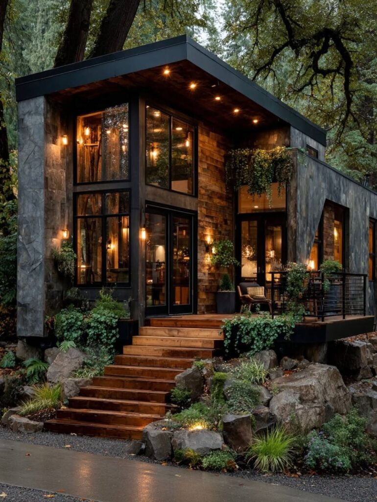 The rugged modern hideaway, built of dark stone and wood, blends the wilderness with refined living. Soft lights glow through large windows, illuminating the rich textures inside. Surrounded by rocks and greenery, it offers peace, privacy, and a deep connection to nature.