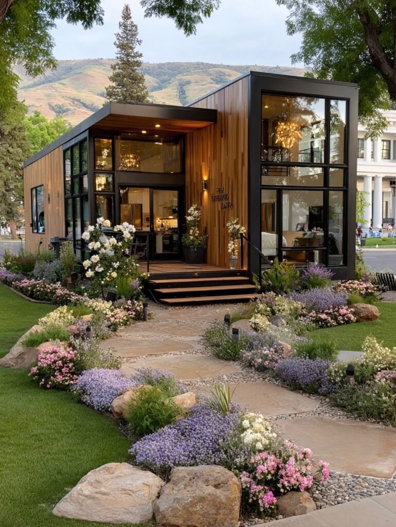 In contrast, the sleek modern home captures luxury in its purest form. With tall glass walls, warm wood tones, and thoughtfully placed lights, it reflects sophistication while still blending into the soft landscape around it. Its design invites natural light to flood each room, creating comfort in every corner.
