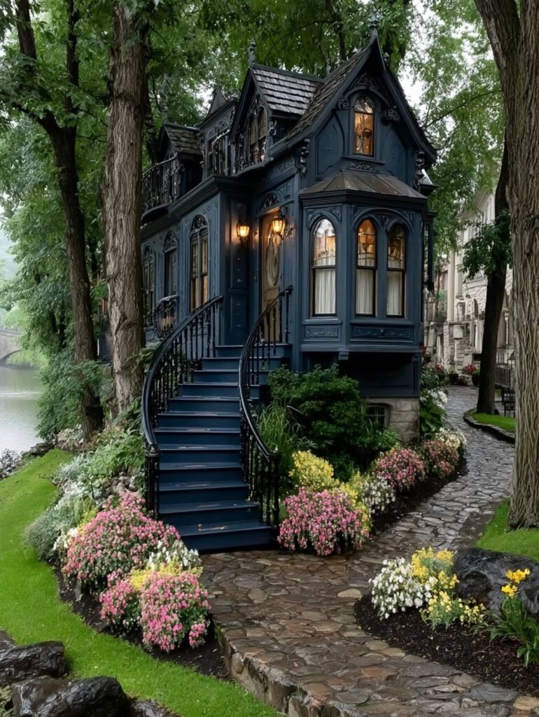 The navy-blue Victorian retreat looks mysterious and enchanting. Winding stairs, glowing lamps, and ornate trim give it an almost magical aura. Perched near the water, it feels like a secret home where creativity flourishes and nights are filled with stories and candlelight.