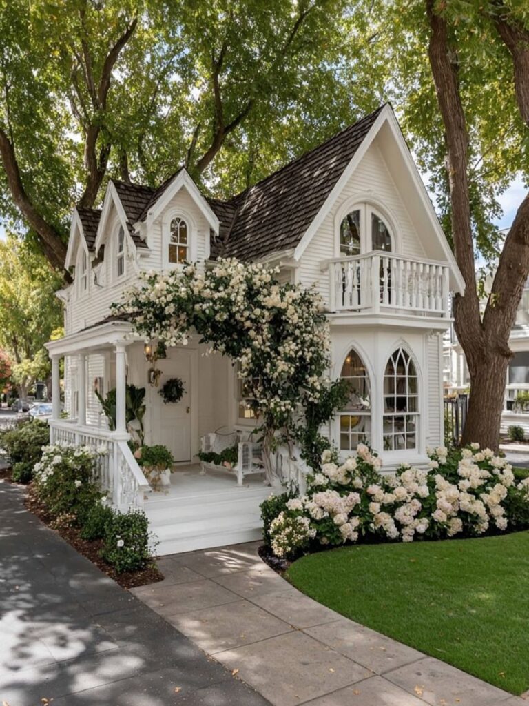The exterior of the cottage looks straight out of a fairytale, with its white clapboard siding, steep gabled roof, and charming balcony. Lush climbing roses and manicured greenery wrap the home in natural beauty, creating a picturesque streetside presence. This façade perfectly captures the romantic character and timeless elegance found throughout the home.