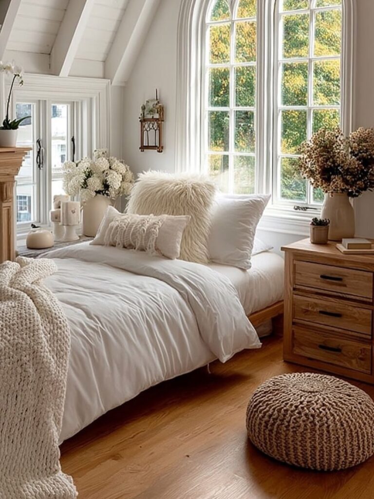 The bedroom exudes warmth and comfort with its soft neutral tones, layered textures, and gentle natural light streaming through tall windows. Crisp white bedding, cozy knit throws, and natural wood furniture create an atmosphere that feels both airy and intimate. Thoughtful décor details and plush textiles make this space ideal for rest and relaxation.