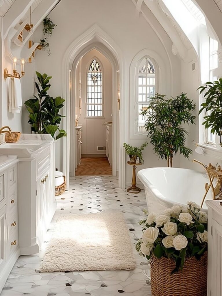 This bathroom is a blend of old-world charm and modern luxury, defined by elegant arched doorways and abundant natural light. A freestanding tub with brass fixtures becomes the focal point, surrounded by greenery that softens the crisp white palette. Marble floors, vintage-inspired vanities, and delicate floral accents transform the space into a calming, spa-like escape.