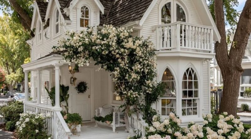 The exterior of the cottage looks straight out of a fairytale, with its white clapboard siding, steep gabled roof, and charming balcony. Lush climbing roses and manicured greenery wrap the home in natural beauty, creating a picturesque streetside presence. This façade perfectly captures the romantic character and timeless elegance found throughout the home.