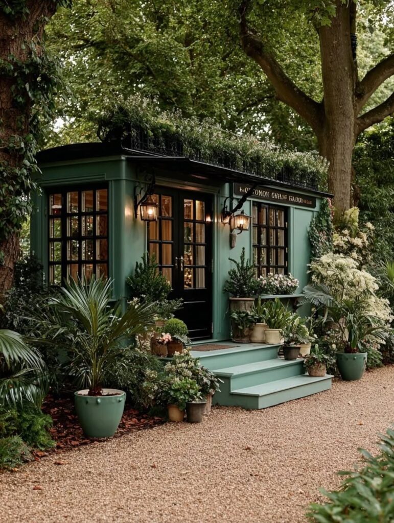 Tucked beneath towering trees, this green garden hideaway feels like a secret retreat known only to nature itself. Lush plants, potted greenery, and delicate lanterns surround the structure, blending architecture and landscape into a peaceful space designed for slow mornings and quiet reflection.
