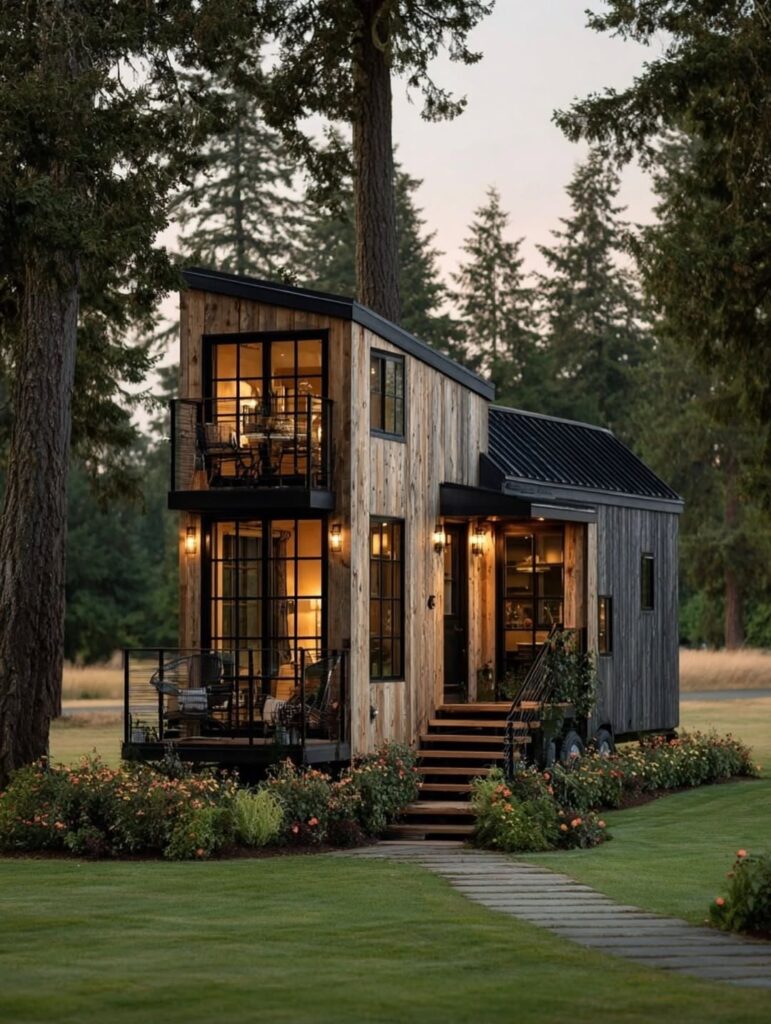 Rising gently on wheels, this two-level tiny house balances modern structure with natural warmth. Large glass doors and balconies invite the outdoors in, while soft lighting inside suggests evenings filled with conversation, comfort, and a strong connection to the surrounding landscape.
