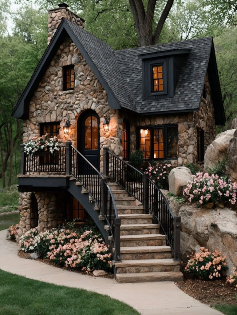 Built of natural stone and crowned with a steep roof, this cottage feels timeless and grounded, as if it has always belonged to the forest around it. Soft light spills from the windows, while the winding staircase and blooming flowers guide you upward, giving the home a quiet fairytale presence.