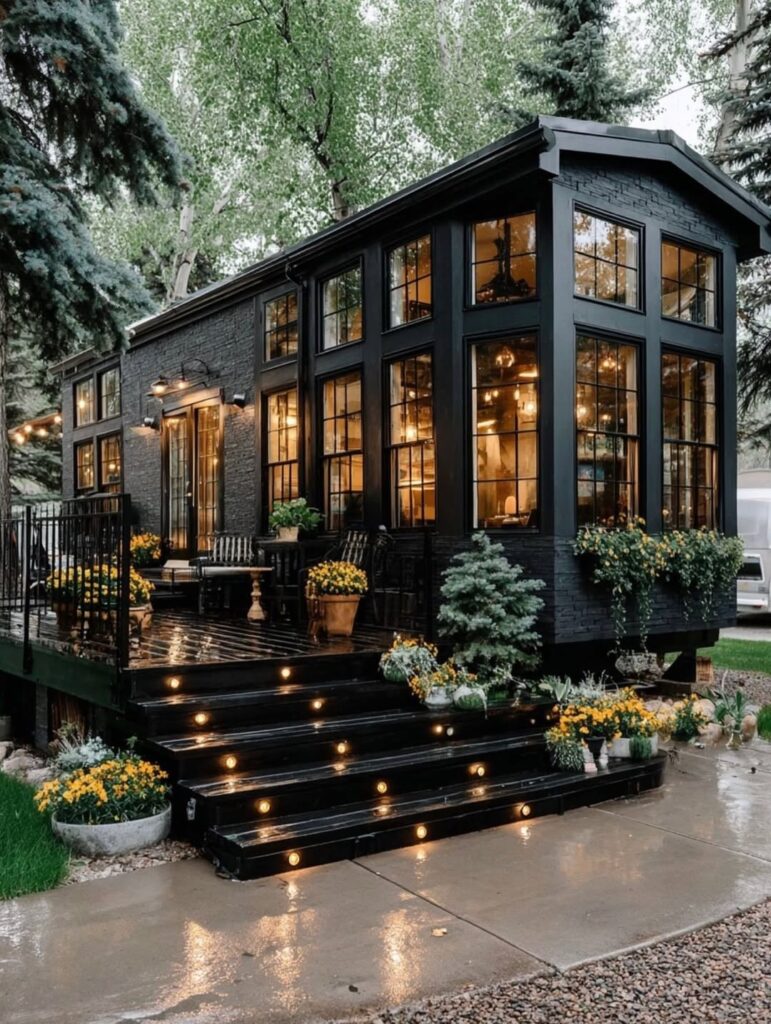 This sleek, black-clad tiny home glows warmly against the rain-soaked surroundings, its large windows revealing a cozy interior filled with golden light. The illuminated steps and carefully placed flowers create an inviting transition from the outdoors, making the home feel both modern and deeply comforting, like a lantern nestled among trees.