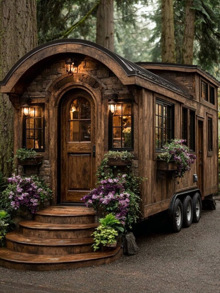A rolling tiny home with arched lines and rich wood textures, this design feels both whimsical and deeply rooted in craftsmanship. The curved doorway, soft lighting, and overflowing blooms transform mobility into romance, turning the road itself into part of the home’s story.