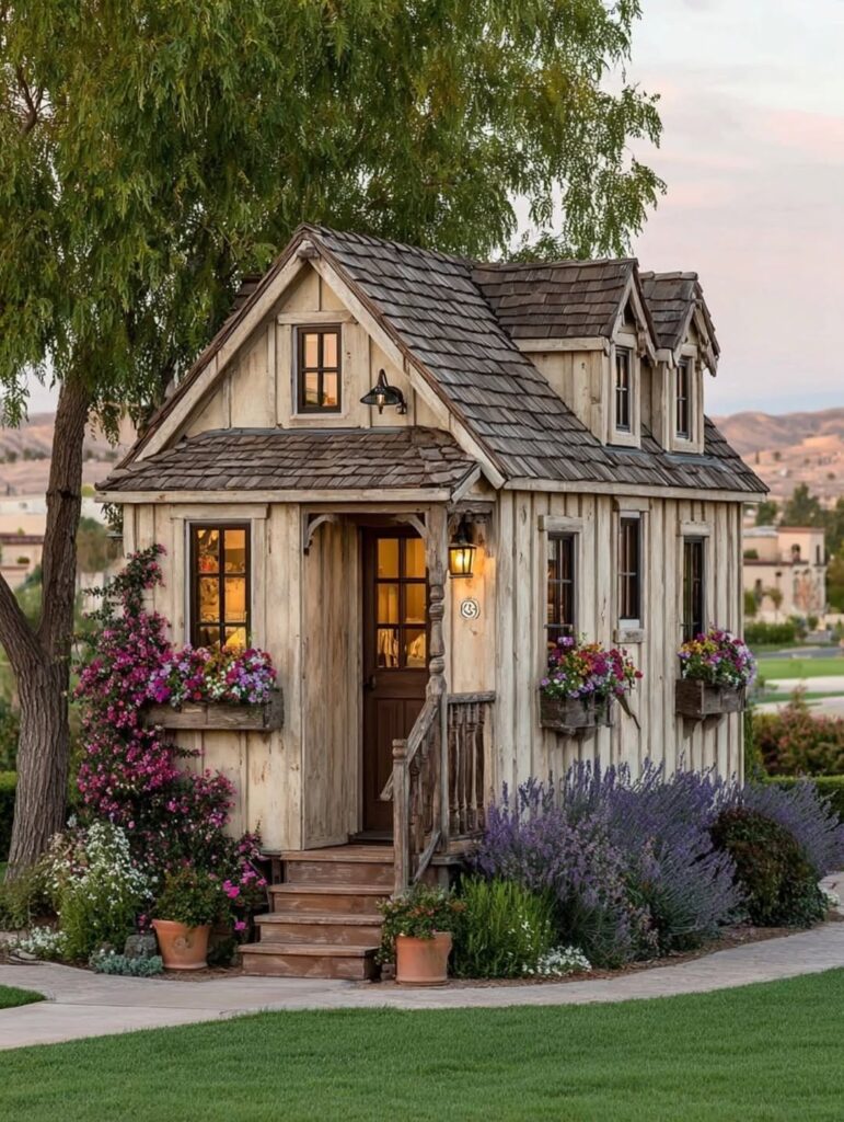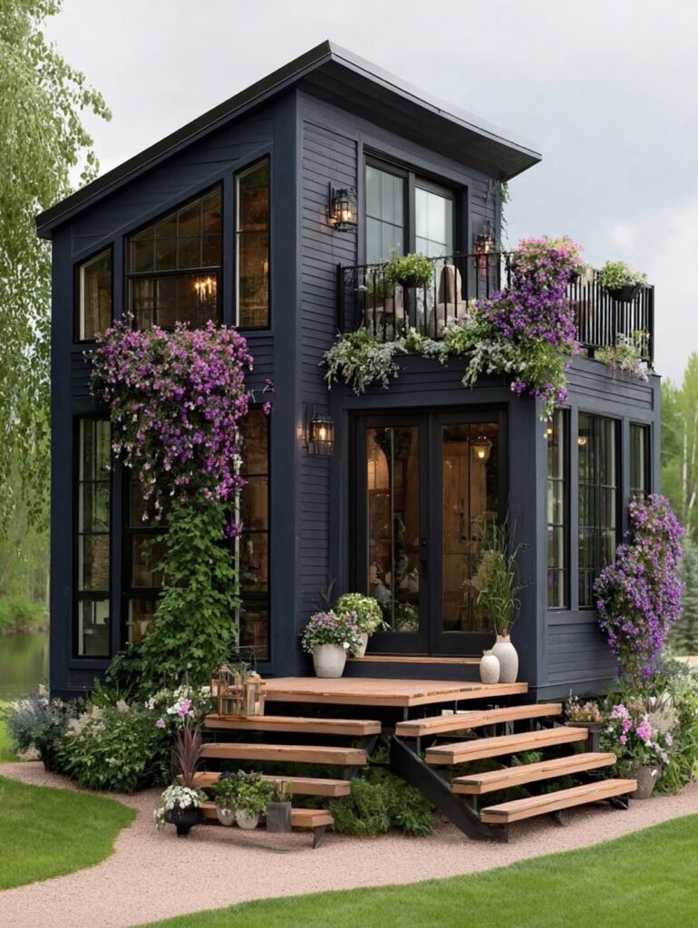 With its deep blue exterior and cascading purple blooms, this tiny home feels elegant yet grounded. Thoughtful landscaping, layered balconies, and expansive windows give the home a sense of openness, proving that small spaces can still feel abundant and refined.