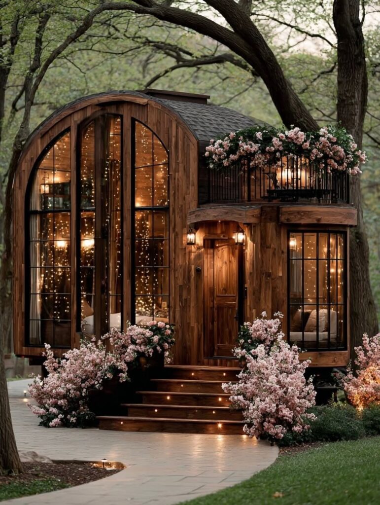 This rounded woodland retreat feels almost storybook-like, with glowing windows and delicate fairy lights shimmering behind tall glass panels. Blossoming flowers frame the entrance, creating a dreamlike atmosphere where nature and shelter blend seamlessly into one magical dwelling.