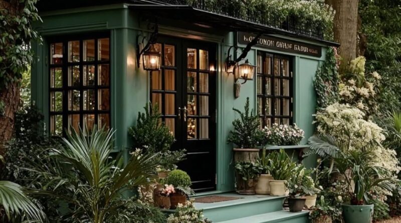 Tucked beneath towering trees, this green garden hideaway feels like a secret retreat known only to nature itself. Lush plants, potted greenery, and delicate lanterns surround the structure, blending architecture and landscape into a peaceful space designed for slow mornings and quiet reflection.
