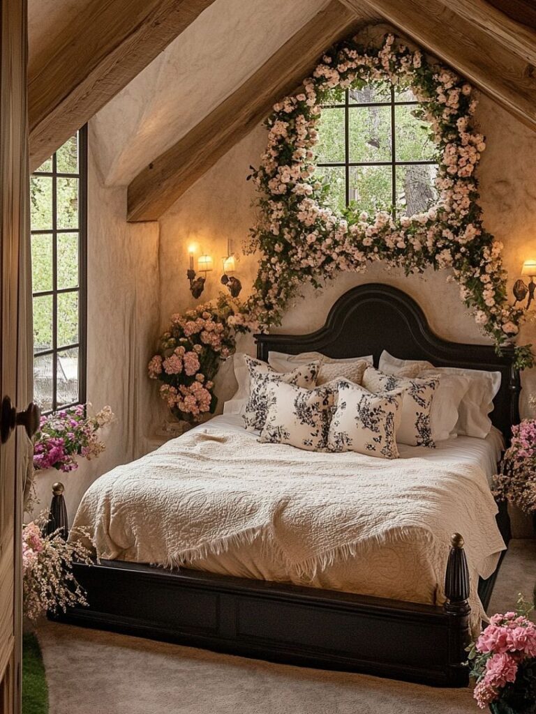 The bedroom is a serene sanctuary, centered around a classic bed framed by climbing florals and soft candlelight. Sloped wooden beams and textured walls add a rustic elegance, while layers of neutral linens and floral accents make the space feel both luxurious and deeply comforting.