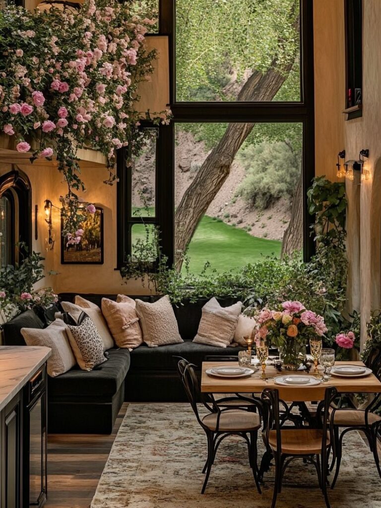 The living and dining area is bathed in natural light from expansive windows that open to lush greenery outside. Soft seating, warm wood tones, and abundant flowers create a welcoming atmosphere, perfect for slow meals, quiet conversations, and moments of calm connection with nature.