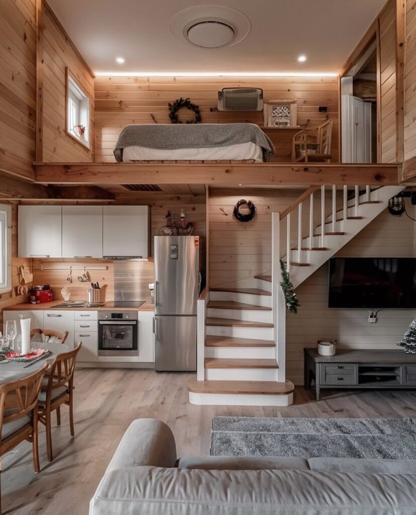 Wrapped in natural wood tones, this compact loft feels cozy and serene. The staircase becomes a sculptural feature, seamlessly connecting the kitchen, living space, and the elevated bed, perfect for a calm retreat-like atmosphere.
