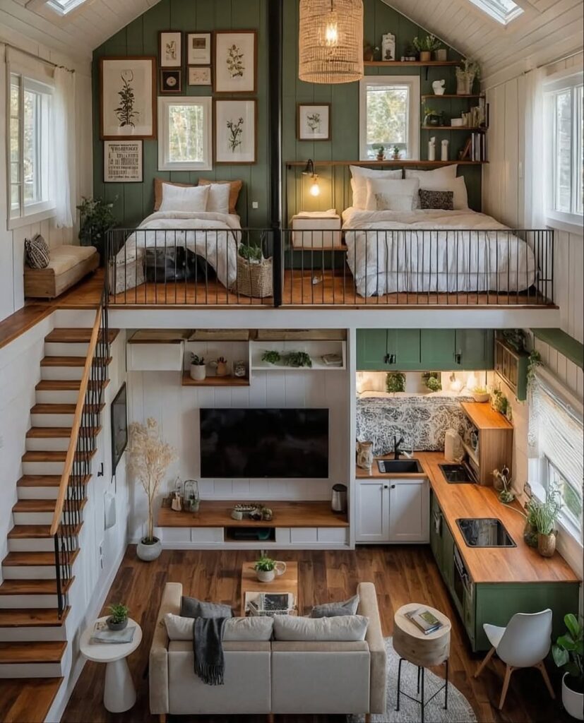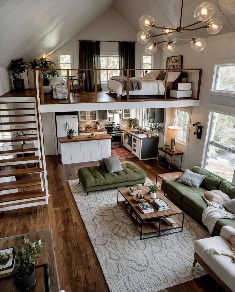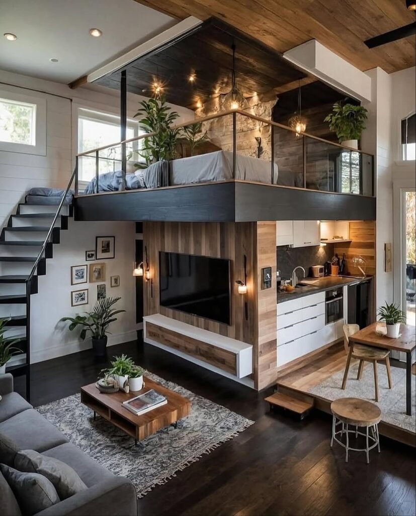 This inviting loft combines modern comfort with a homey atmosphere. The open living room, warm wood accents, and elevated bedroom create a perfect balance between functionality and relaxation.