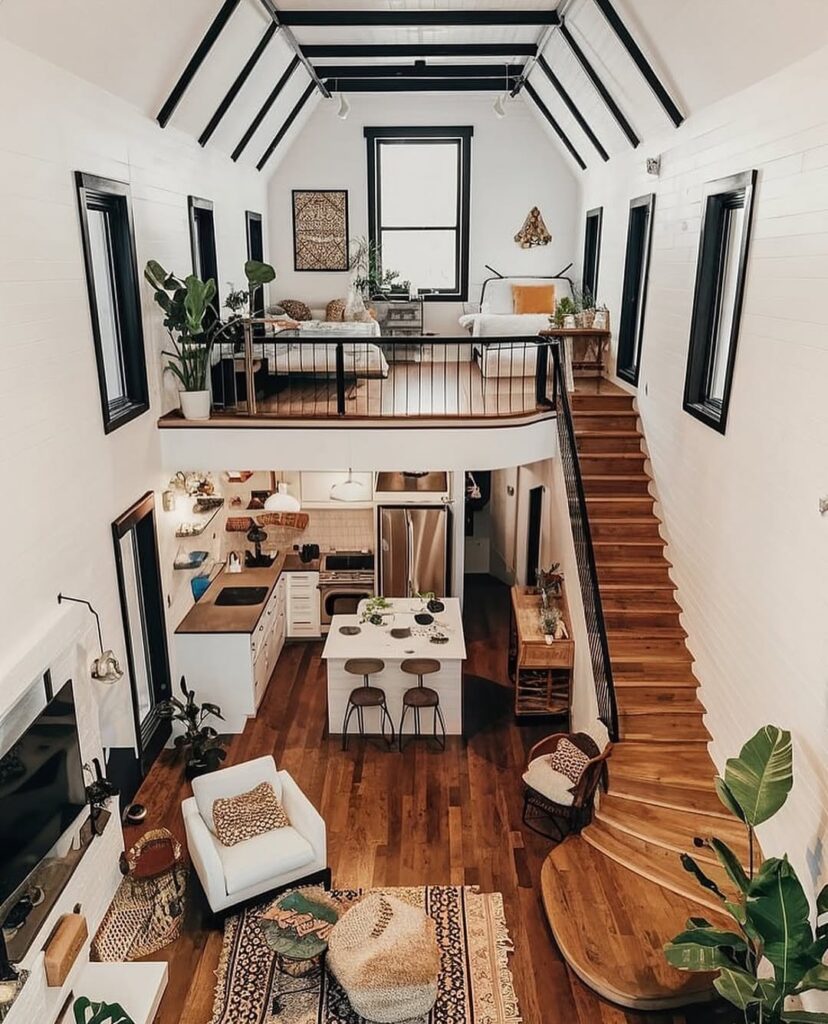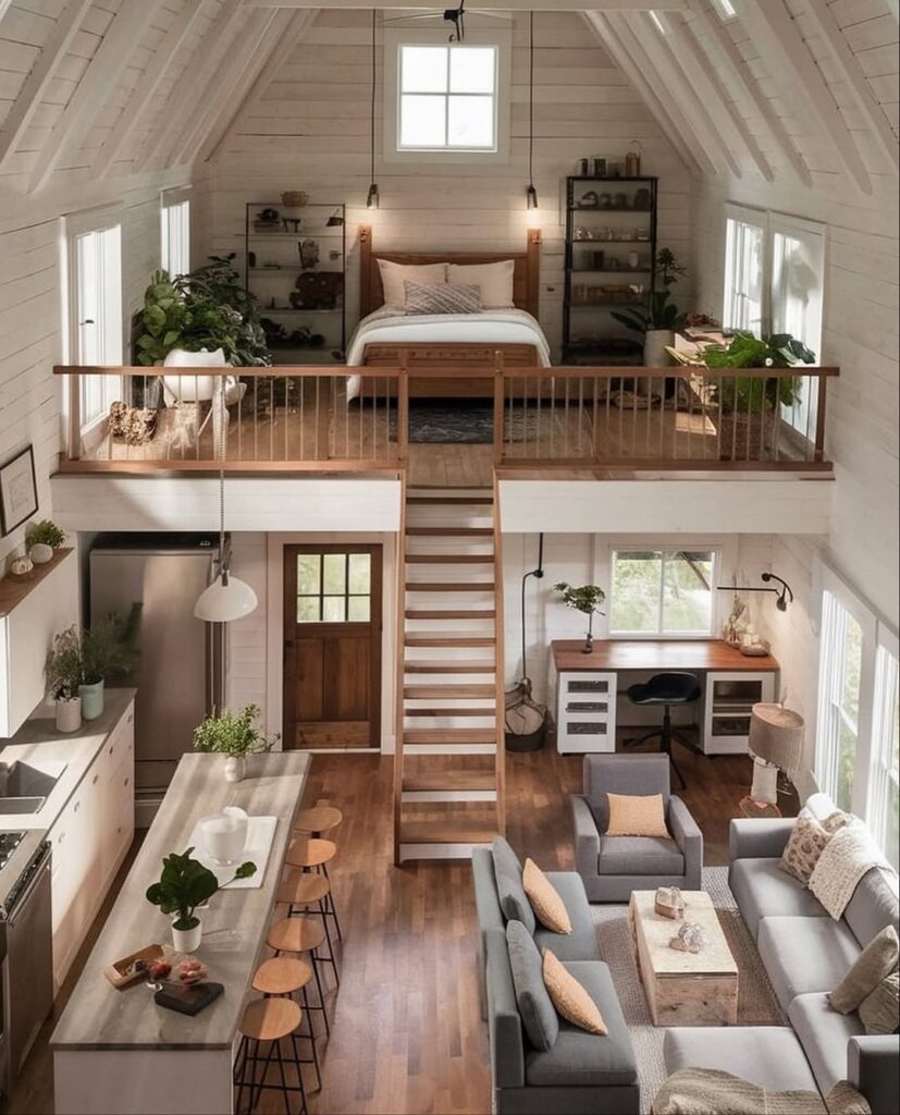 This bright, modern loft showcases an open-plan design where clean white walls, warm wood floors, and black accents create a balanced, contemporary aesthetic. The elevated sleeping area overlooks a cozy living and kitchen space, making the home feel airy, functional, and thoughtfully layered.