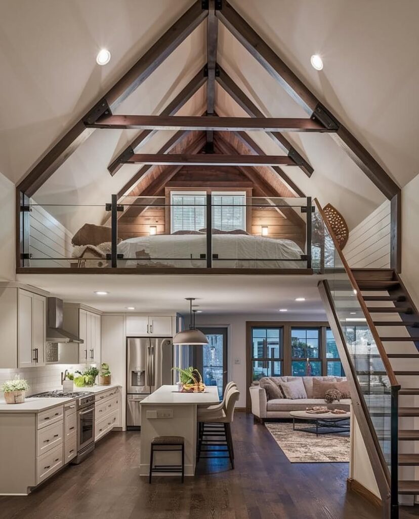 Exposed wooden beams frame this elegant loft bedroom, giving it a warm, architectural character. The glass railing keeps the space visually open while allowing natural light to flow freely between the sleeping loft and the inviting living area below.