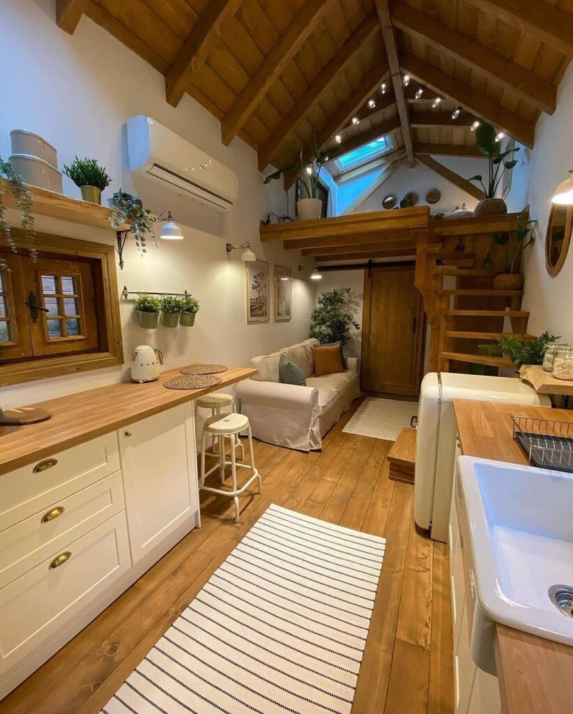 This compact kitchen is designed with both beauty and efficiency in mind. Wooden countertops, white cabinetry, and hanging plants add warmth, while the thoughtful layout makes everyday cooking feel effortless.