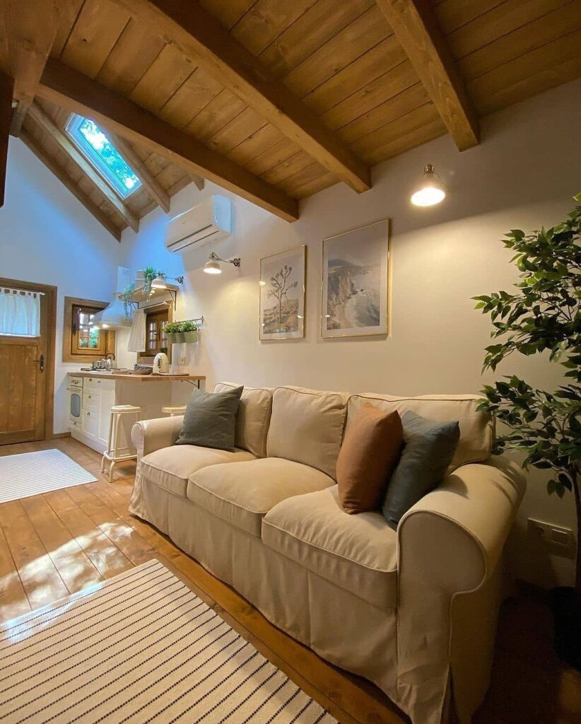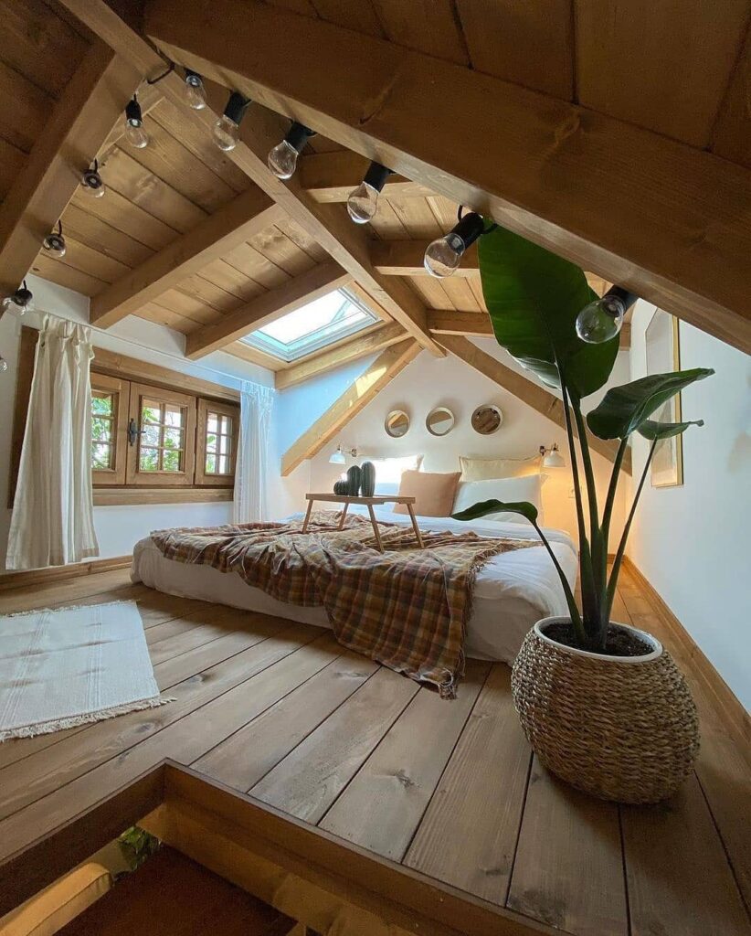 Tucked beneath exposed wooden beams, the loft bedroom feels intimate and serene. Natural light filters through the skylight, highlighting warm wood textures and soft textiles that make the space ideal for rest and relaxation.
