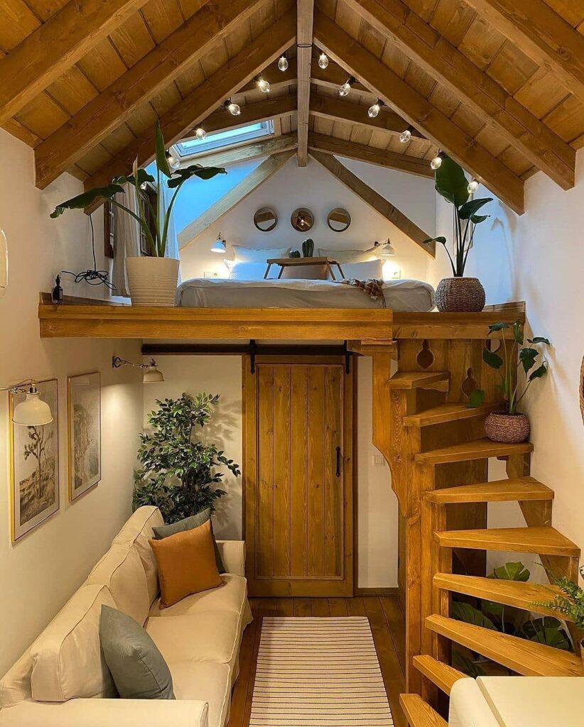 The elevated sleeping area overlooks the living space, reinforcing the home’s cozy yet airy feel. String lights and natural finishes add a touch of magic, making the loft a peaceful retreat above it all.