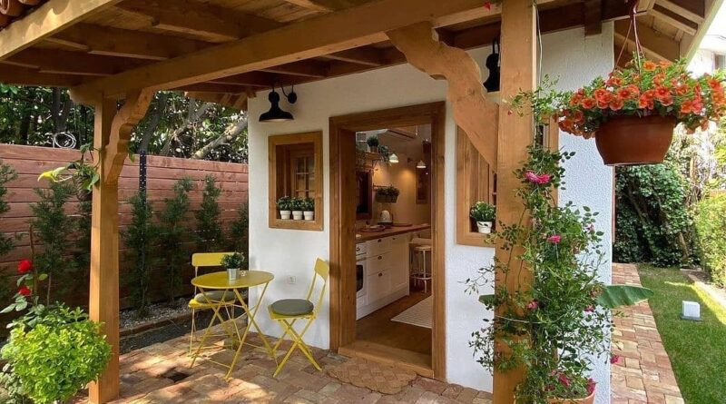The welcoming exterior blends natural wood, clay tiles, and lush greenery to create a warm, storybook-like entrance. The small patio with café seating invites quiet mornings outdoors, where nature and architecture feel seamlessly connected.