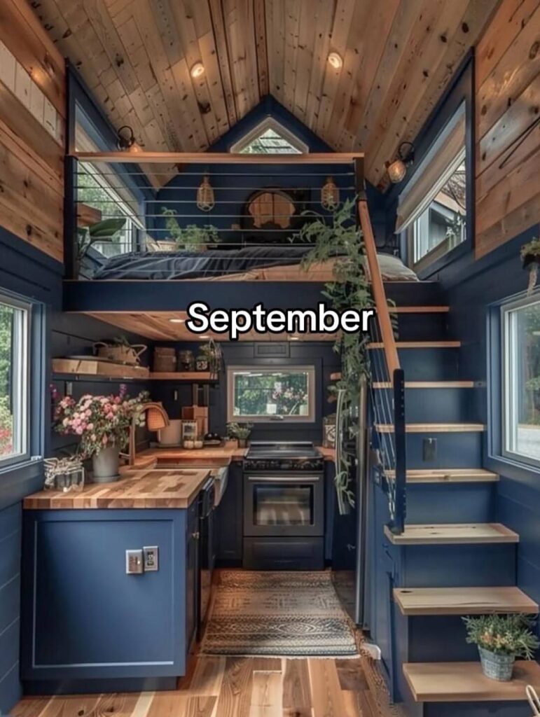 September introduces depth and richness, with darker tones, warm wood, and thoughtful details. This tiny home feels mature and cozy, capturing the calm transition from summer to fall and the comfort of slowing down.