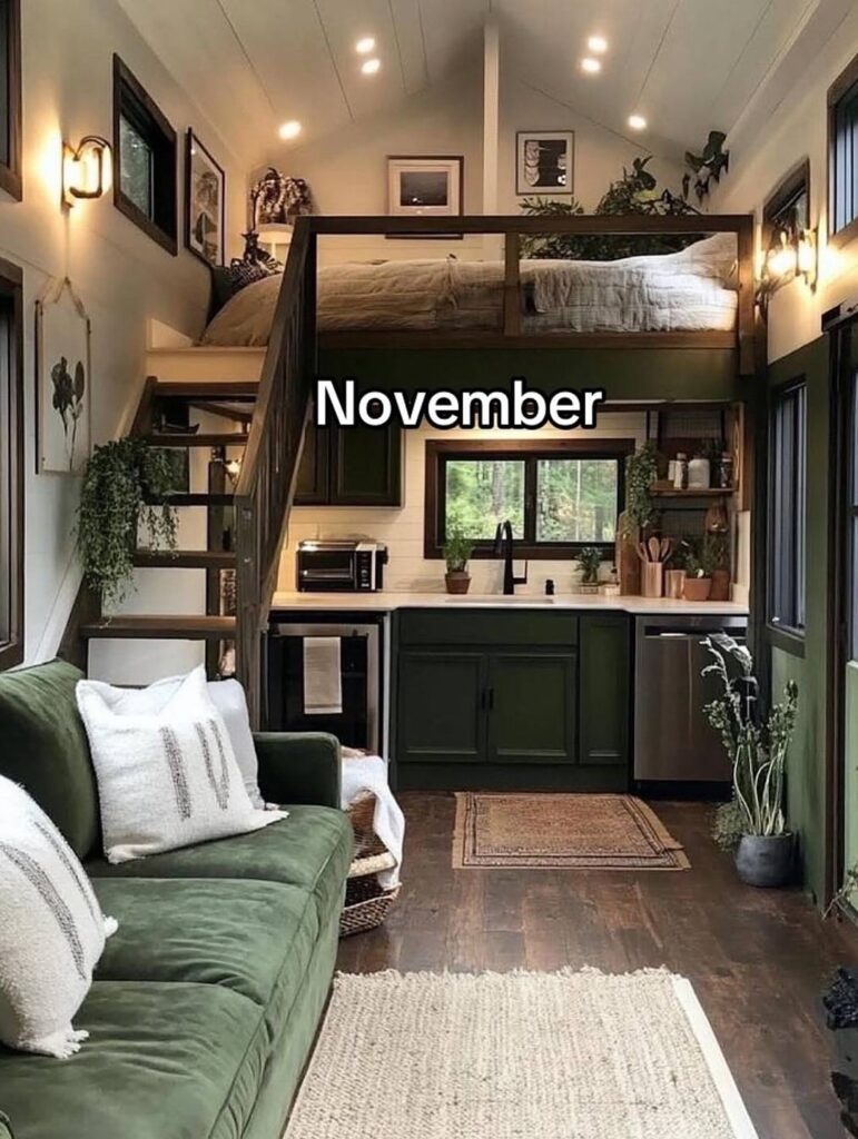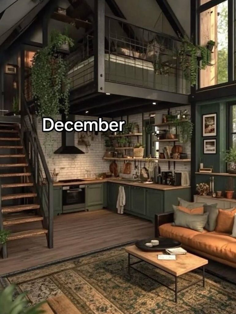 November’s interior balances coziness with simplicity, embracing muted greens, warm wood, and gentle light. The compact layout feels intentional and inviting, with every corner thoughtfully used to create comfort without clutter. Soft textiles, natural light from the windows, and subtle greenery bring a sense of calm as the season shifts. This space feels like a pause between autumn and winter—a home that encourages rest, gratitude, and quiet routines.