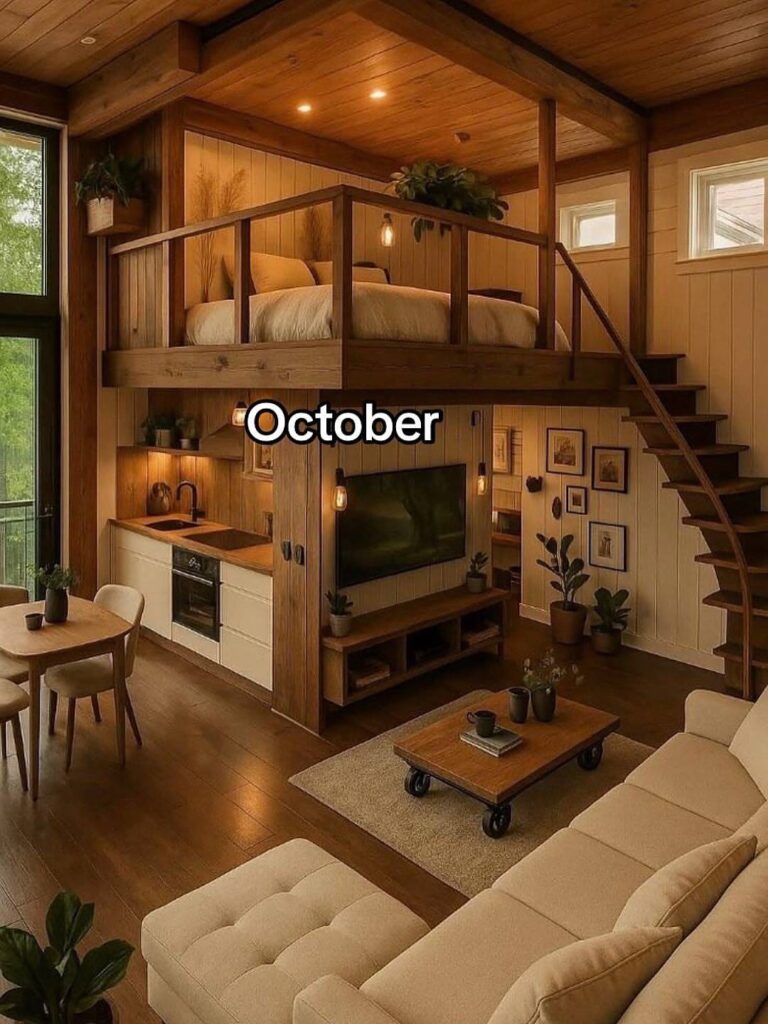 October arrives with warmth and depth, wrapped in rich wood finishes and golden lighting. The lofted sleeping area adds a sense of charm and intimacy, while the open living space below feels welcoming and grounded. Natural materials and soft neutrals echo the changing season outside, creating a connection between indoors and nature. It’s a home that feels perfect for crisp evenings, warm drinks, and slowing down as autumn settles in.