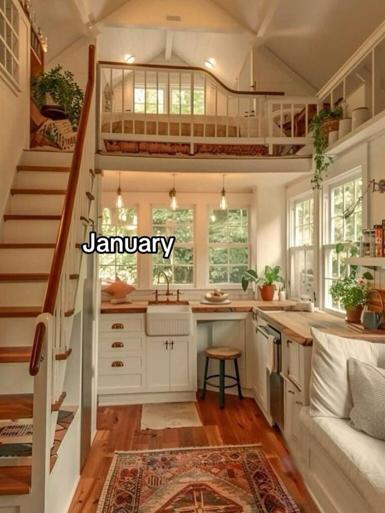 January feels warm, welcoming, and grounded—a tiny house that embraces winter with soft light, natural wood, and cozy corners. The farmhouse-style kitchen and lofted sleeping space create a sense of comfort and calm, perfect for slow mornings and quiet evenings indoors.