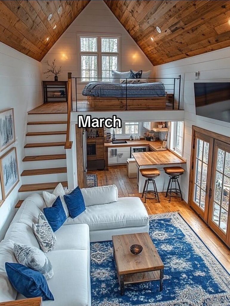 March is bright, airy, and balanced, blending clean lines with rustic warmth. The open living area and elevated bedroom feel fresh and renewed, echoing the early signs of spring and a sense of openness after the colder months.