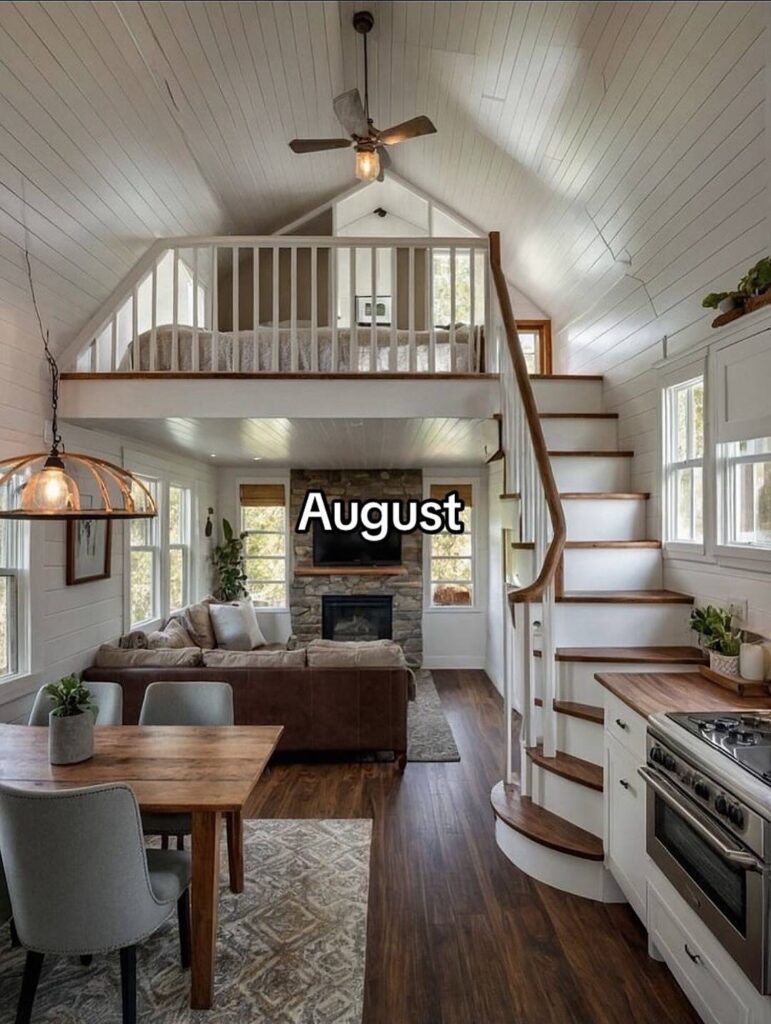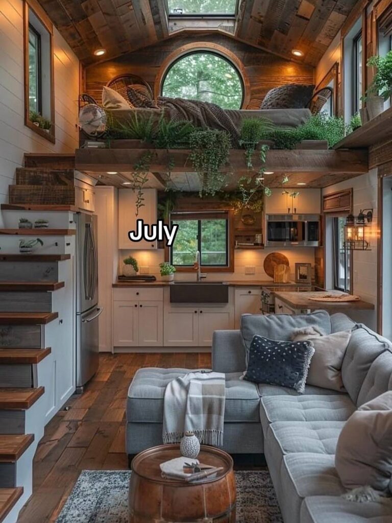 July is lush, cozy, and full of life, with greenery cascading through the loft and warm lighting throughout. This tiny home feels connected to nature, offering a relaxed, summer-ready atmosphere that encourages rest and togetherness.