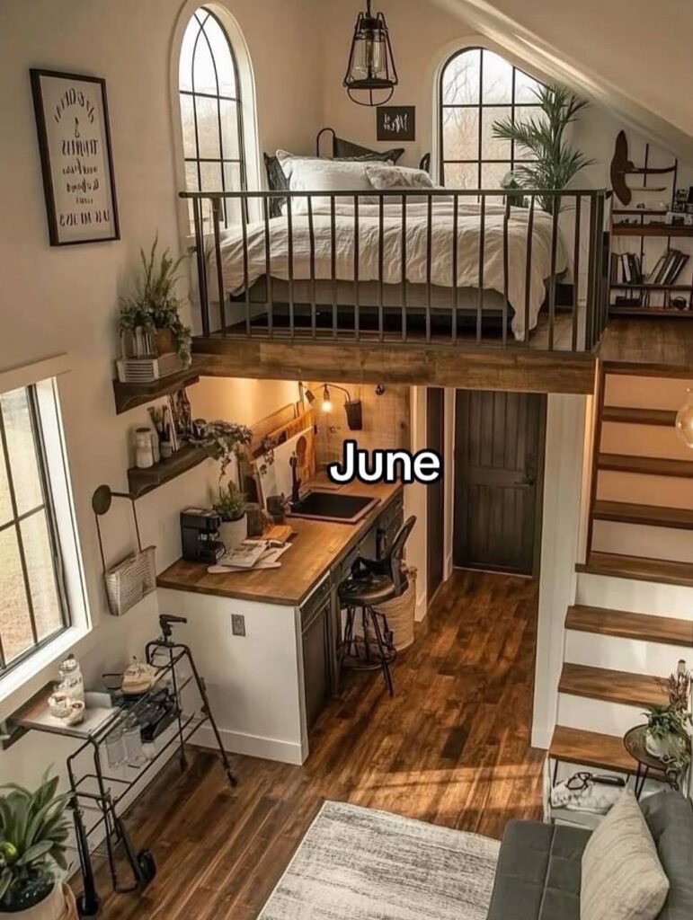June embraces creativity and charm, with layered levels and warm wood floors that make the tiny home feel lived-in and personal. It’s a space designed for both productivity and relaxation, ideal for long days and golden evenings.