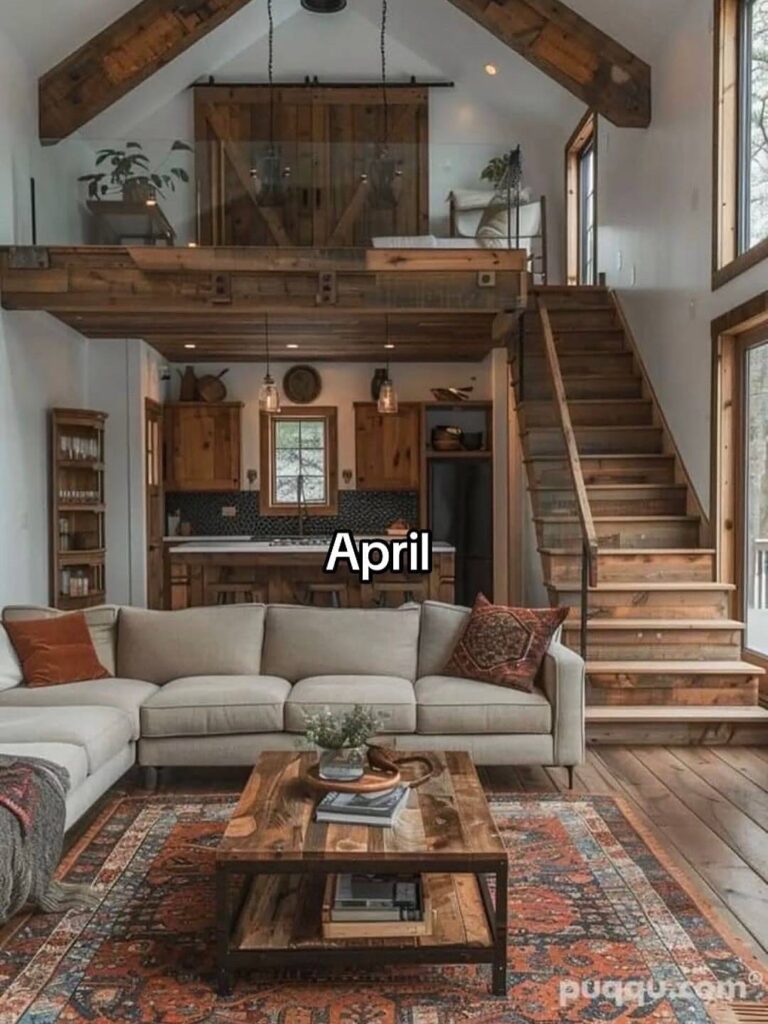 April showcases rustic elegance, with rich wood finishes and earthy textures throughout. This space feels grounded yet inviting, offering a perfect mix of comfort and craftsmanship that mirrors the steady, blooming transition into spring.