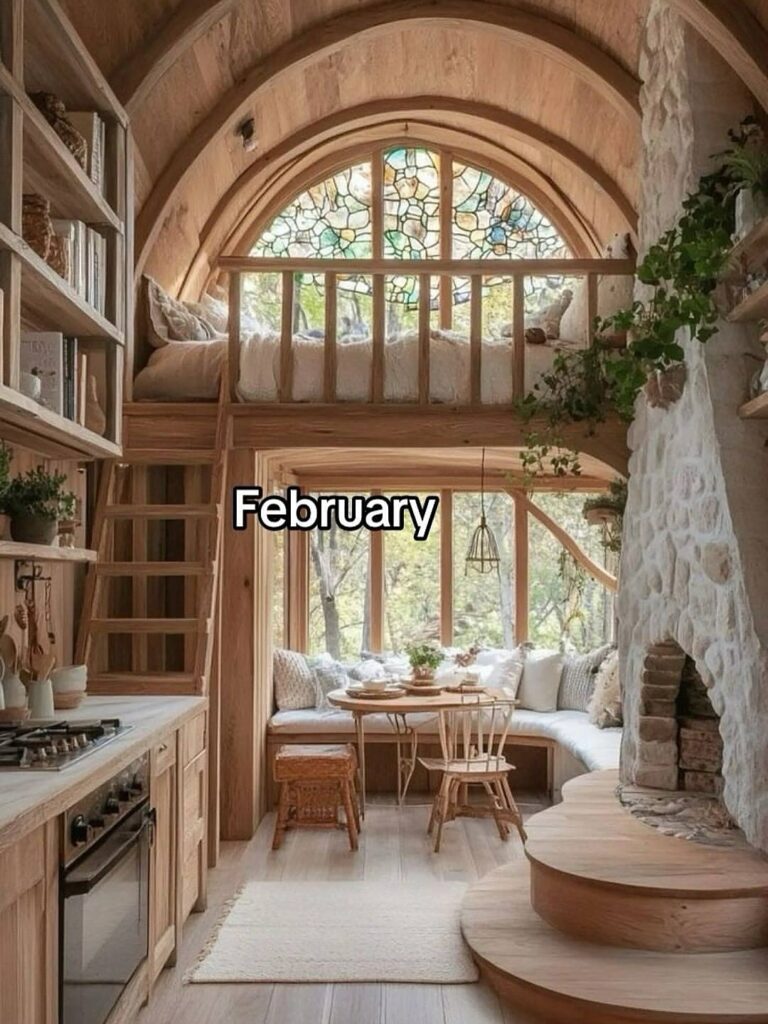 February brings a storybook charm with its arched windows, stone textures, and soft neutral tones. This tiny home feels romantic and peaceful, where natural light pours in and every detail invites rest, reflection, and a deep connection to nature outside.