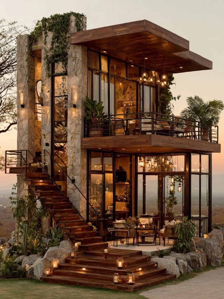 Rising gently above the landscape, this multi-level home celebrates light, openness, and panoramic views. Stone, wood, and glass work together to create a warm yet contemporary atmosphere, while lanterns and interior lighting add a sense of intimacy at dusk. It feels like a peaceful lookout—designed for slow mornings, golden sunsets, and thoughtful living.