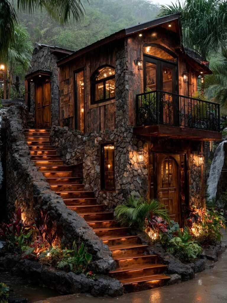 This home feels like a hidden rainforest retreat, carved from stone and wrapped in warm wood. Soft lighting along the steps and balconies creates a welcoming glow, while the surrounding tropical plants and flowing water blur the boundary between architecture and nature. It’s a place designed for quiet evenings, rain-soaked views, and deep connection to the landscape.
