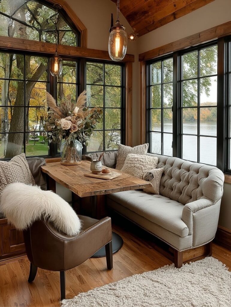 This charming dining nook is framed by expansive windows that invite the outdoors in. Plush seating, a solid wood table, and soft accents create an intimate setting ideal for slow meals, coffee moments, and enjoying the surrounding views.