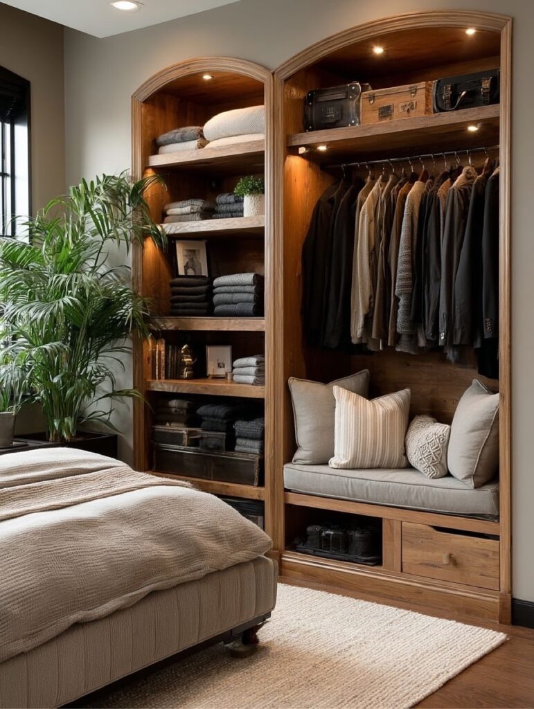 This beautifully built-in closet combines functionality with comfort, featuring rich wood cabinetry, open shelving, and a cushioned bench nook. Thoughtful lighting and neatly arranged textiles give the space a boutique-like feel that is both practical and luxurious.
