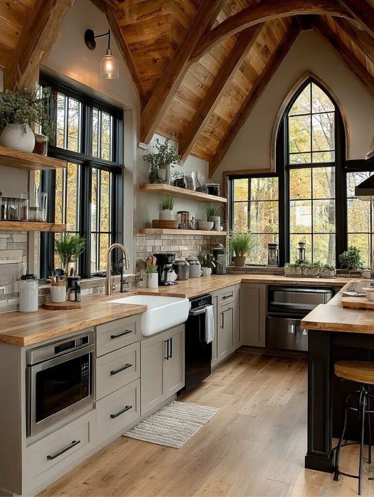 This kitchen pairs classic farmhouse elements with modern convenience. Wooden countertops, open shelving, and stone accents add rustic character, while stainless steel appliances and thoughtful layout ensure the space remains highly functional and welcoming.