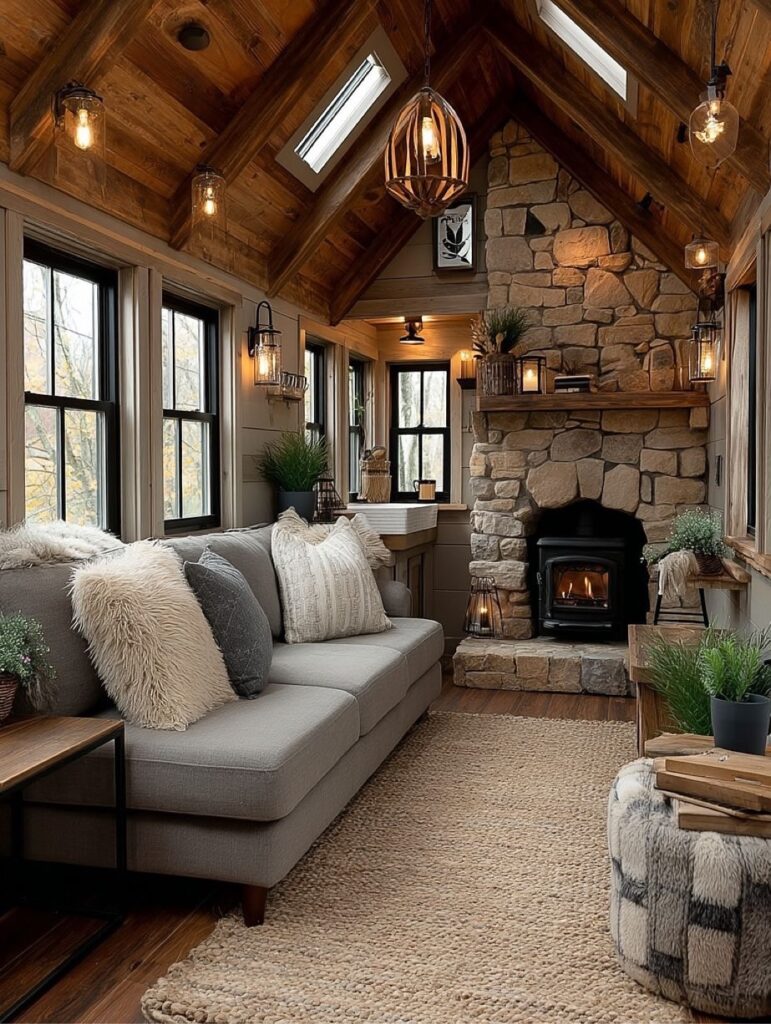 The living area centers around a stone fireplace that radiates warmth and comfort. Soft furnishings, layered textures, and warm lighting complement the natural wood ceiling, creating a perfect gathering space for relaxing evenings.