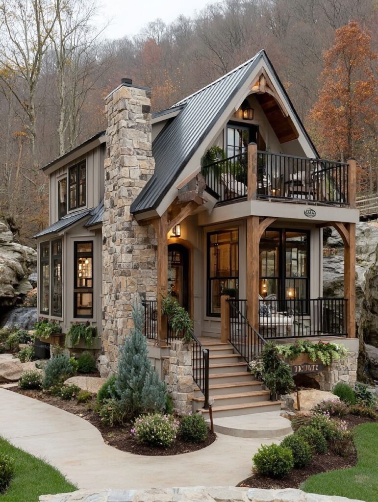 The exterior showcases a storybook-style cottage with stone, wood beams, and a steep metal roof. Balconies, warm lighting, and natural landscaping blend seamlessly with the surrounding forest, giving the home a timeless and inviting presence.