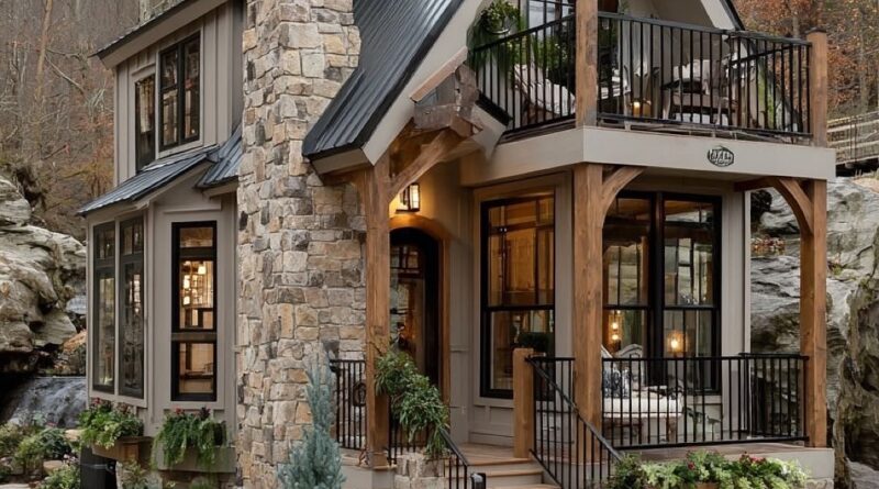 The exterior showcases a storybook-style cottage with stone, wood beams, and a steep metal roof. Balconies, warm lighting, and natural landscaping blend seamlessly with the surrounding forest, giving the home a timeless and inviting presence.
