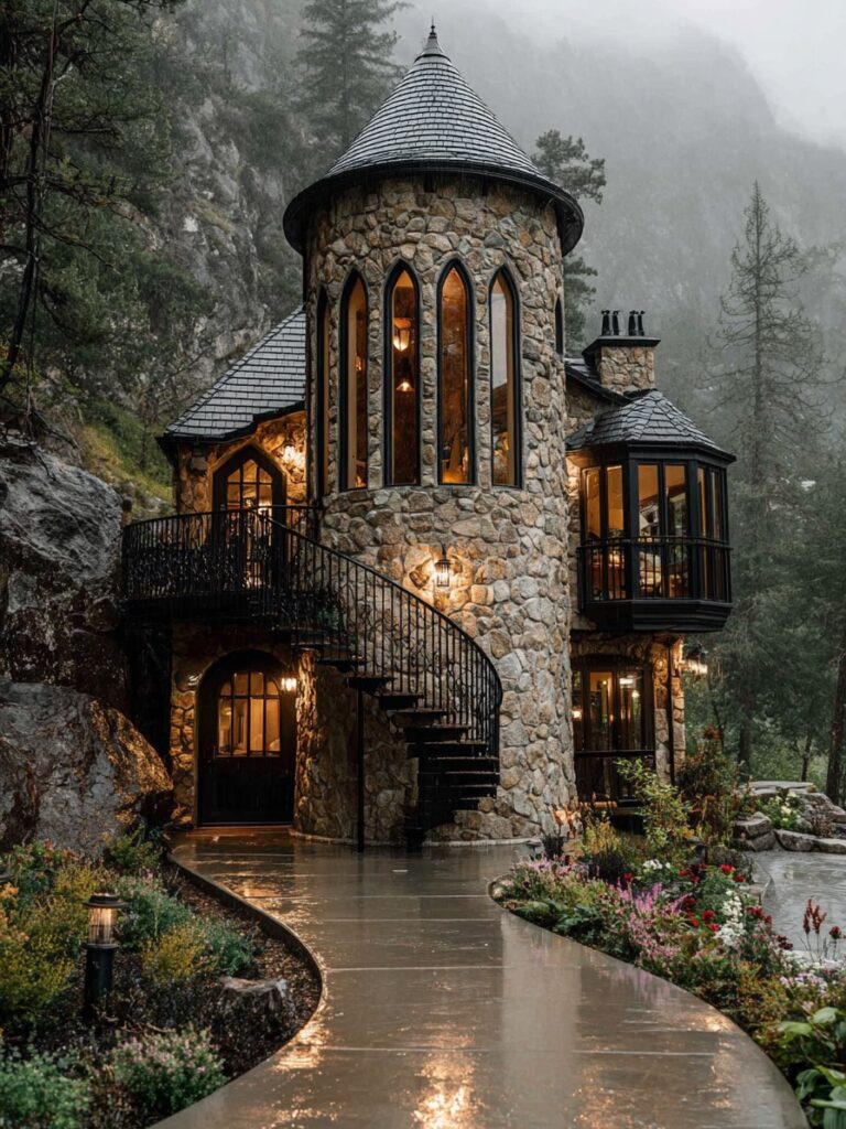 The exterior captures a fairytale-like stone tower home nestled into a misty landscape. Curved staircases, arched windows, and glowing interior lights give the structure a storybook presence, blending seamlessly with the surrounding nature and evoking timeless romance and escape.