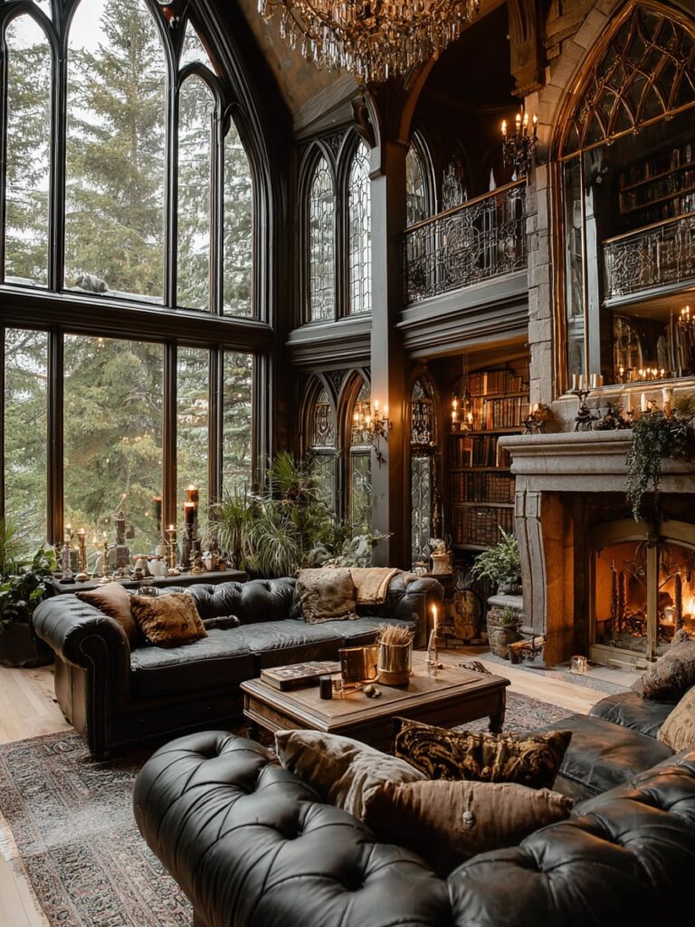 A dramatic living room unfolds with soaring windows, a stone fireplace, and rich architectural details that echo classic European interiors. The arrangement of leather seating, books, and warm lighting creates a refined yet inviting space designed for conversation, reflection, and cozy gatherings.