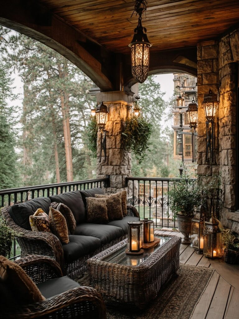 This covered terrace creates an intimate outdoor retreat, blending rustic stone columns with rich wood ceilings and soft lantern light. The woven seating, layered textiles, and candlelit accents invite slow evenings surrounded by nature, where comfort and craftsmanship feel perfectly balanced.