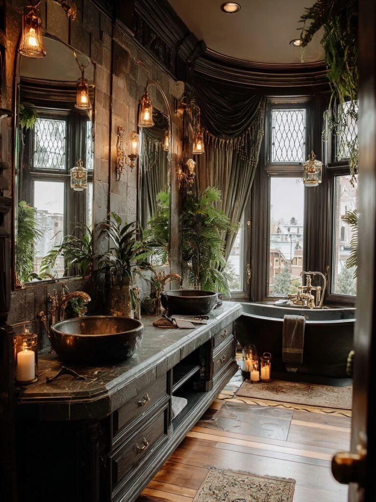 The bathroom exudes dramatic luxury, with dark cabinetry, stone textures, and warm metallic lighting creating a moody, spa-like atmosphere. Lush greenery softens the space, while reflective surfaces and candlelight add depth and a sense of quiet indulgence.